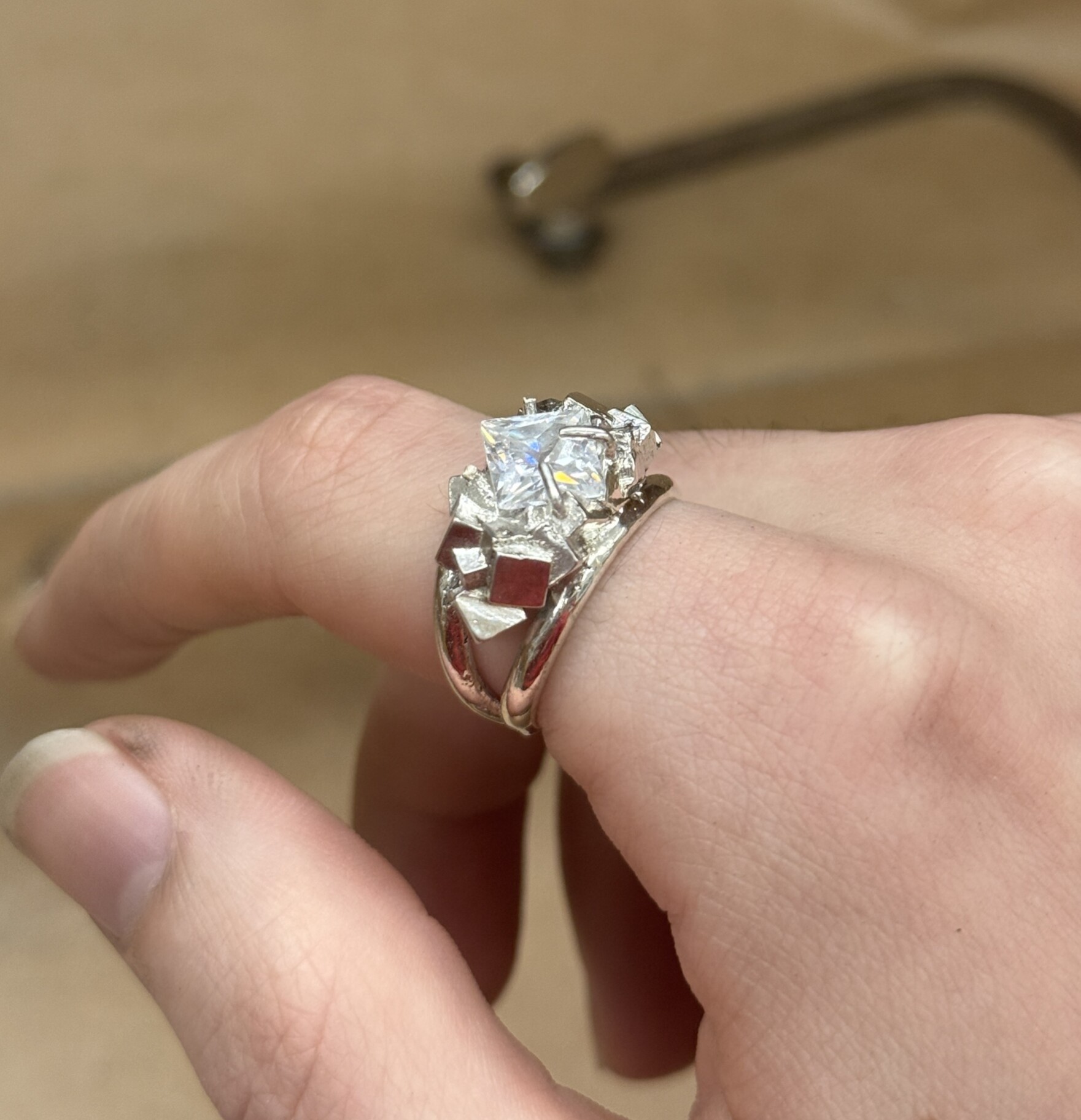 Sterling silver bands holding a geode-like setting for a stone.